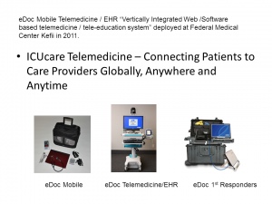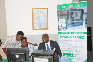 Home Plus CTO at the exhibition stand of the 9th Nigerian Conference on Telemedicine and eHealth in 2015 demonstrating a web baseed telemedicne system with a Pulse Oximeter reading the Oxgen saturation of a guest